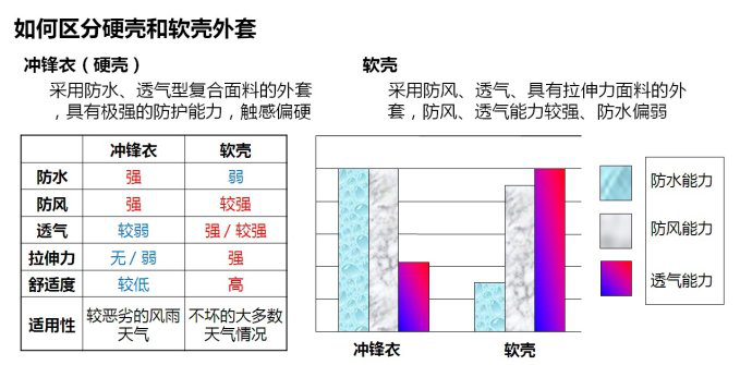 下面從一張圖區(qū)別硬殼軟殼沖鋒衣,簡單來說硬殼更加戶外專業(yè),功能性更強(qiáng),適合戶外活動(dòng)穿;而軟殼是在原有保暖防風(fēng)面料上增添一個(gè)防水層,功能性差一些,但同樣具備防水性能,適合日常交際穿著。